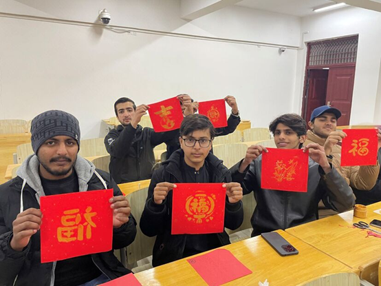 本网讯(信息工程学院)12月26日下午,信息工程学院团总支在濂溪校区科创A308教室开展“墨印东方韵,红纸系友谊”主题活动,来自巴基斯坦的留学生与各班学生代表一同参与。