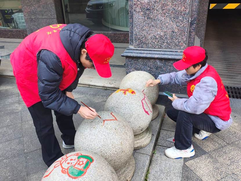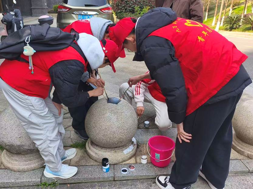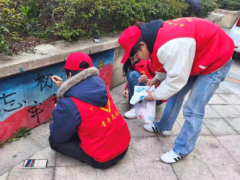 活动中,志愿者们以社区墙体、石墩为画布,手持环保颜料与画笔,将“不忘初心”等标语融入创作,一笔一画尽显家国情怀与青春担当。原本单调的墙面与石墩在色彩和线条的装点下变得生动鲜活,既为社区增添了饱含爱国情怀的亮丽色彩,也让红色文化融入居民日常生活。同学们纷纷表示,此次彩绘实践将绘画专业技能与红色文化传播相结合,既深化了思想认识、提升了实践能力,也以实际行动为社区环境美化与文化建设贡献了青春力量。