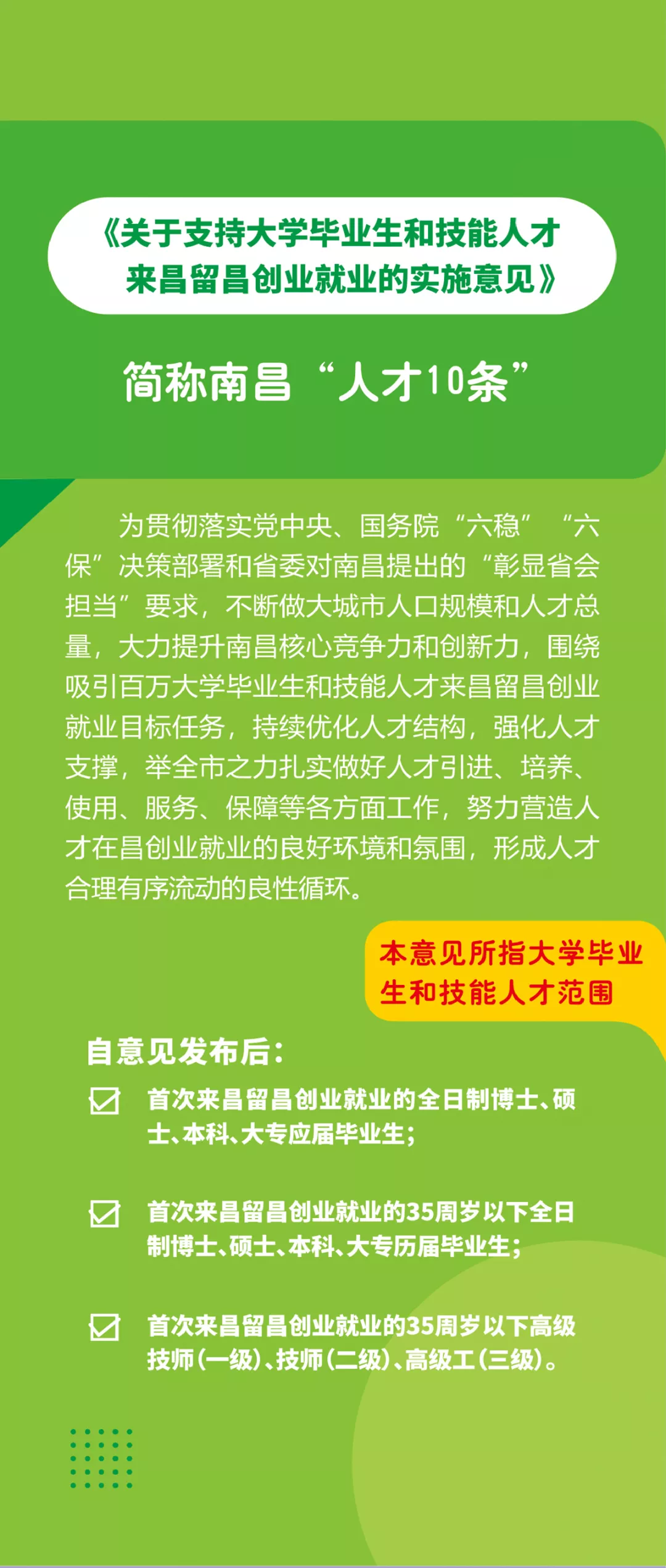 近日,南昌市委、市政府围绕“吸引百万大学毕业生和技能人才来昌留昌创业就业”的目标任务,重点面向35周岁以下大学毕业生和技能人才,制定出台了《关于支持大学毕业生和技能人才来昌留昌创业就业的实施意见》(洪发〔2020〕9号)(简称南昌“人才10条”)。