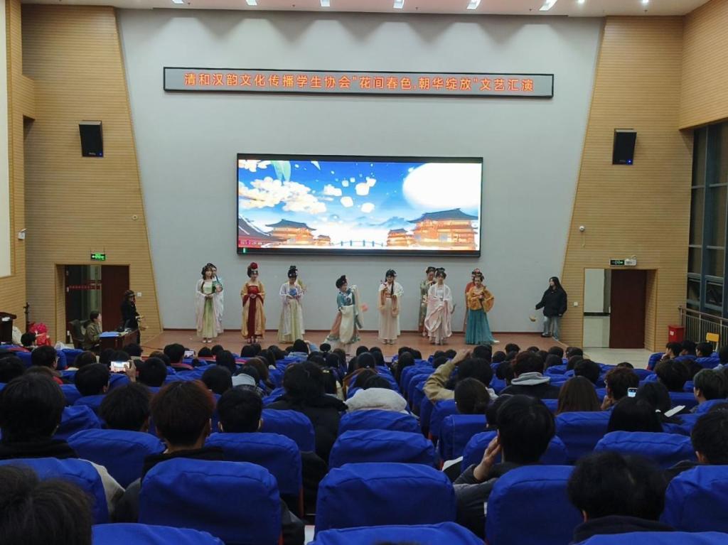 本网讯(信息工程学院)3月11日晚,信息工程学院清和汉韵文化传播学生协会在濂溪校区图书馆C区多功能厅举办“花间春色,朝华绽放”文艺汇演,该社团全体成员参加。