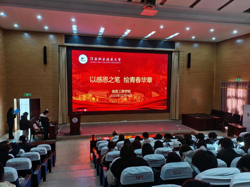 本网讯 (信息工程学院)12月4日,信息工程学院学生会秘书部、院素质拓展中心与清和汉韵文化传播学生协会一同在濂溪校区办公楼报告厅开展“以感恩之笔,绘青春华章”主题教育活动,300余名学生参加。