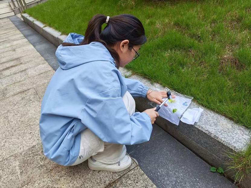 实践环节中,同学们来到科创楼一楼空地,手持橡胶锤,将新鲜的花瓣、叶片固定在棉布上轻轻敲击,看着天然色素慢慢渗透,勾勒出独一无二的图案。同学们纷纷表示:看着植物一点一点变成布料上的花纹,感受到了传统技艺的魅力和中华传统文化的深厚底蕴。
