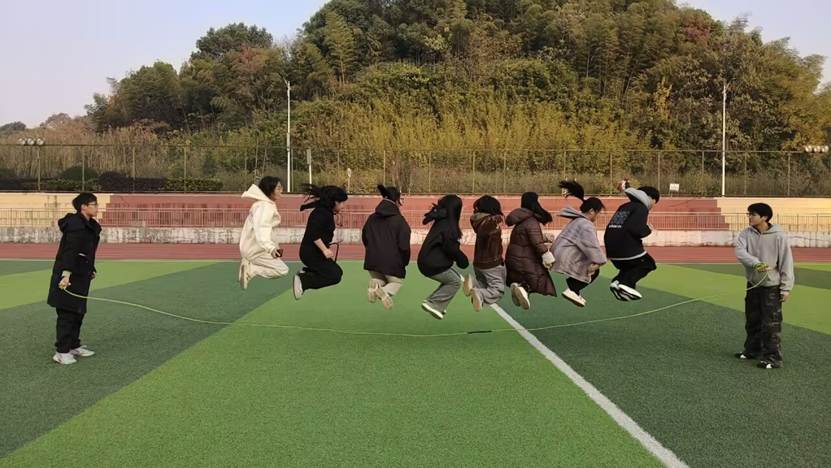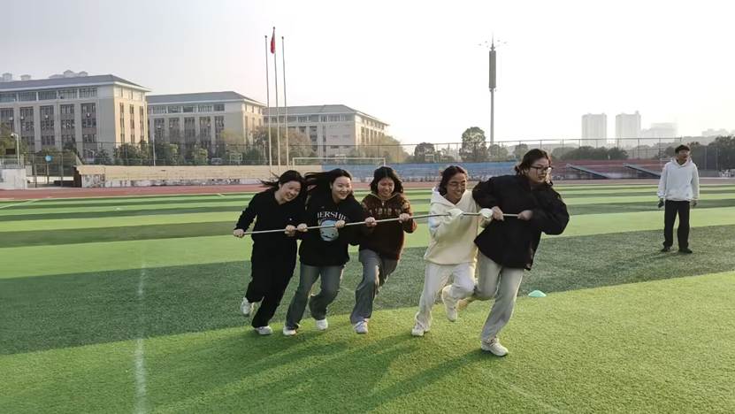 活动共设旋风跑、水到渠成、夹球接力、拔河及多人跳绳五项趣味项目,均注重团队协作与现场互动。在旋风跑中,各组队员紧握长杆、步调统一,在疾驰与转向中展现默契;水到渠成环节,同学们通过精准配合,助力小球平稳传递;夹球接力环节,同学们两两夹球同步奔走,在平衡与冲刺间磨合节奏;拔河赛场呼声震天,一次次拉扯将气氛推向高潮;多人跳绳则绳起人跃,节奏一致,勾勒出活力涌动的冬日风景。