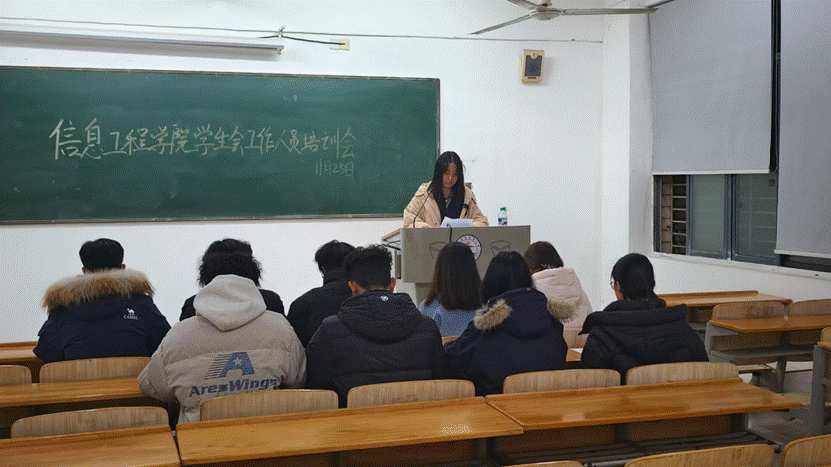 本网讯(信息工程学院)为加强学生会队伍建设,提升学生会工作人员的综合能力与服务水平,11月25日19时,信息工程学院学生会在濂溪校区教学楼115教室开展秋季学生会工作人员培训会。此次会议由该院学生会秘书长谭笑主讲,该院学生会成员积极。
