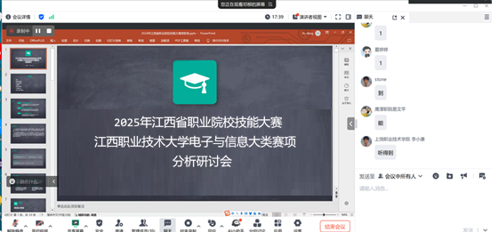 11月29日,电子信息产教虚拟教研室以线上形式成功举办2025年江西省职业院校技能大赛江西职业技术大学赛区电子与信息大类赛项分析研讨会。来自全省各职业院校的电子信息类专业教师、虚拟教研室成员单位代表齐聚云端,围绕赛项亮点、参赛表现、教学衔接等核心议题展开深度研讨,聚力探索“以赛促教、以赛促学、以赛促改”的实践路径。