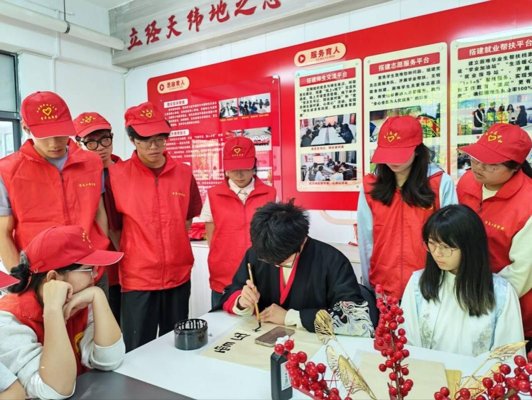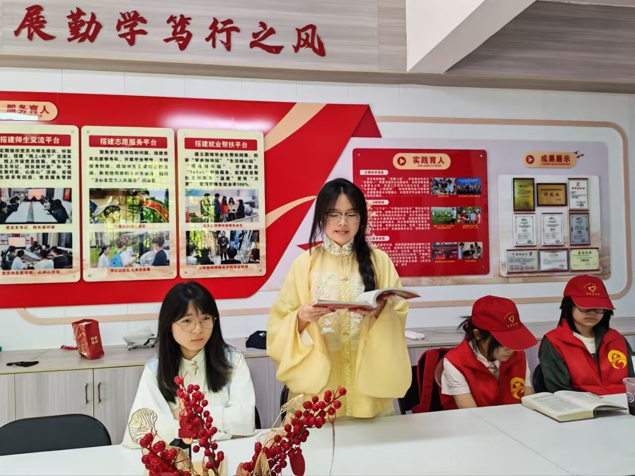 活动中,几位身着汉服的同学率先带领大家诵读经典诗词。从李白的豪放洒脱到李清照的婉约细腻,让大家在诵读中感受到了中国古典文学之美。在书法环节,同学们纷纷拿起毛笔,手书经典诗词名句,一笔一划间饱含着对传统文化的敬意。随后,大家交流读书心得,有的同学分享了自己阅读古典名著时的困惑与收获,引发了大家的共鸣;有的同学推荐了自己最近读到的好书,简单介绍了书中的精彩内容;还有同学结合自身求学经历,畅谈读书对意志力和耐心的影响。大家畅所欲言,现场气氛热烈融洽。