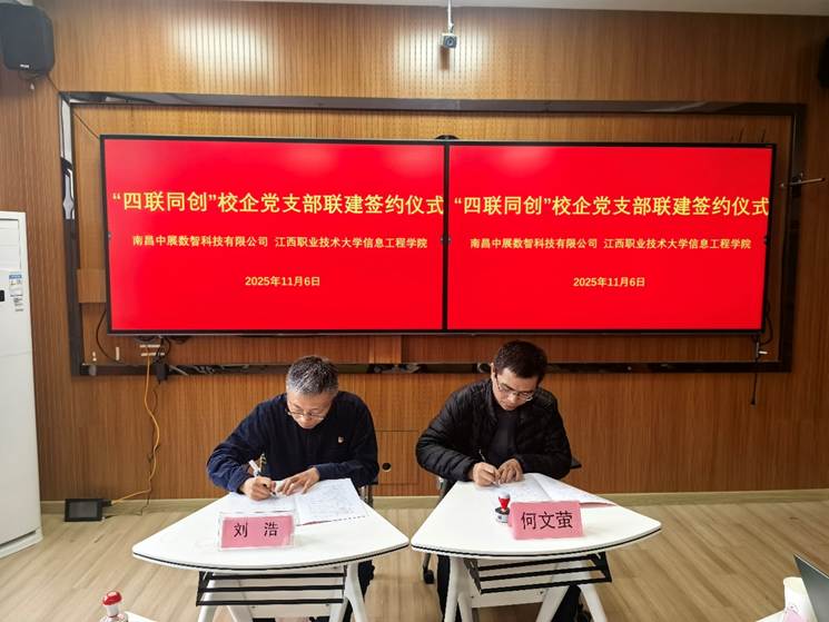 会议最后,双方举行了校企党支部结对共建合作签约仪式,并围绕党建阵地联建、党员联培、活动联办、人才联育四个方面进行了深入交流,就电子信息工程技术专业群学生职业素养进行研讨。针对专业群学生职业素养核心能力提升,共同开发“电子信息专业群AI职业罗盘”达成共识。